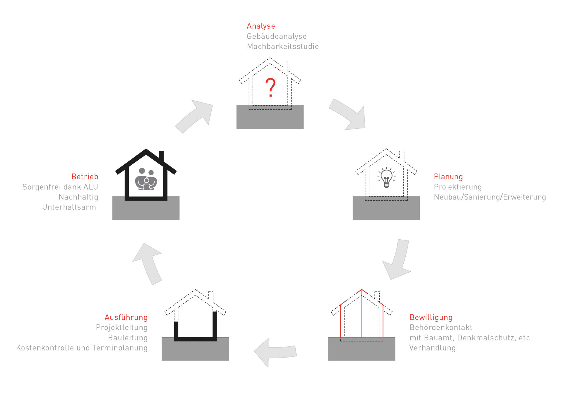 Wir begleiten Sie durch den gesamten Lebenszyklus Ihrer Immobilien: vom Neubau, über die Renovation/Sanierung bis hin zum Abbruch und Wiederaufbau.